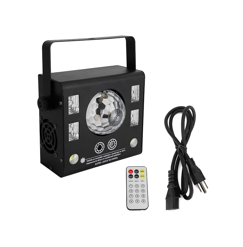 This 4-in-1 multi-functional magic ball stage light integrates four lighting systems, including a rotatable four-color magic ball light, a Uv light effect light, a high-brightness white strobe light, and a red-green dual-color laser beam. A single unit can independently or in combination present over thirty dynamic lighting effects. It supports four working modes: DMX512 14-channel protocol control, voice-activated sensing, automatic programming, and master-slave synchronization. The user interface is intuitive and easy to use. The all-metal body with double handles and an adjustable stand facilitates hanging or floor placement. Its wide voltage design is compatible with global 95 to 245V Ac power supplies, making it widely applicable to home parties, commercial performances, festival celebrations, and entertainment venues, easily creating an immersive lighting atmosphere.