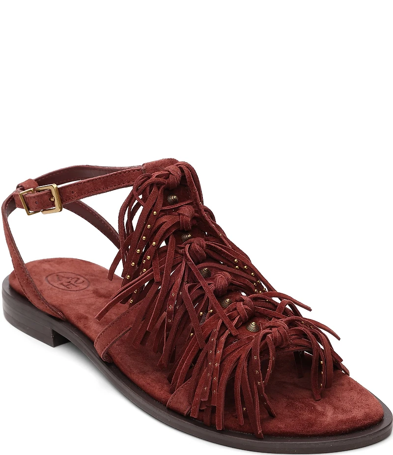 From ASH, the Panic Suede Tassel Ankle Strap Flat Sandals feature: Suede upper with tassel detailing Buckle closure Leather lining Memory-foam cushioning Rubber outsole Approx. 0.7" heel height Imported.