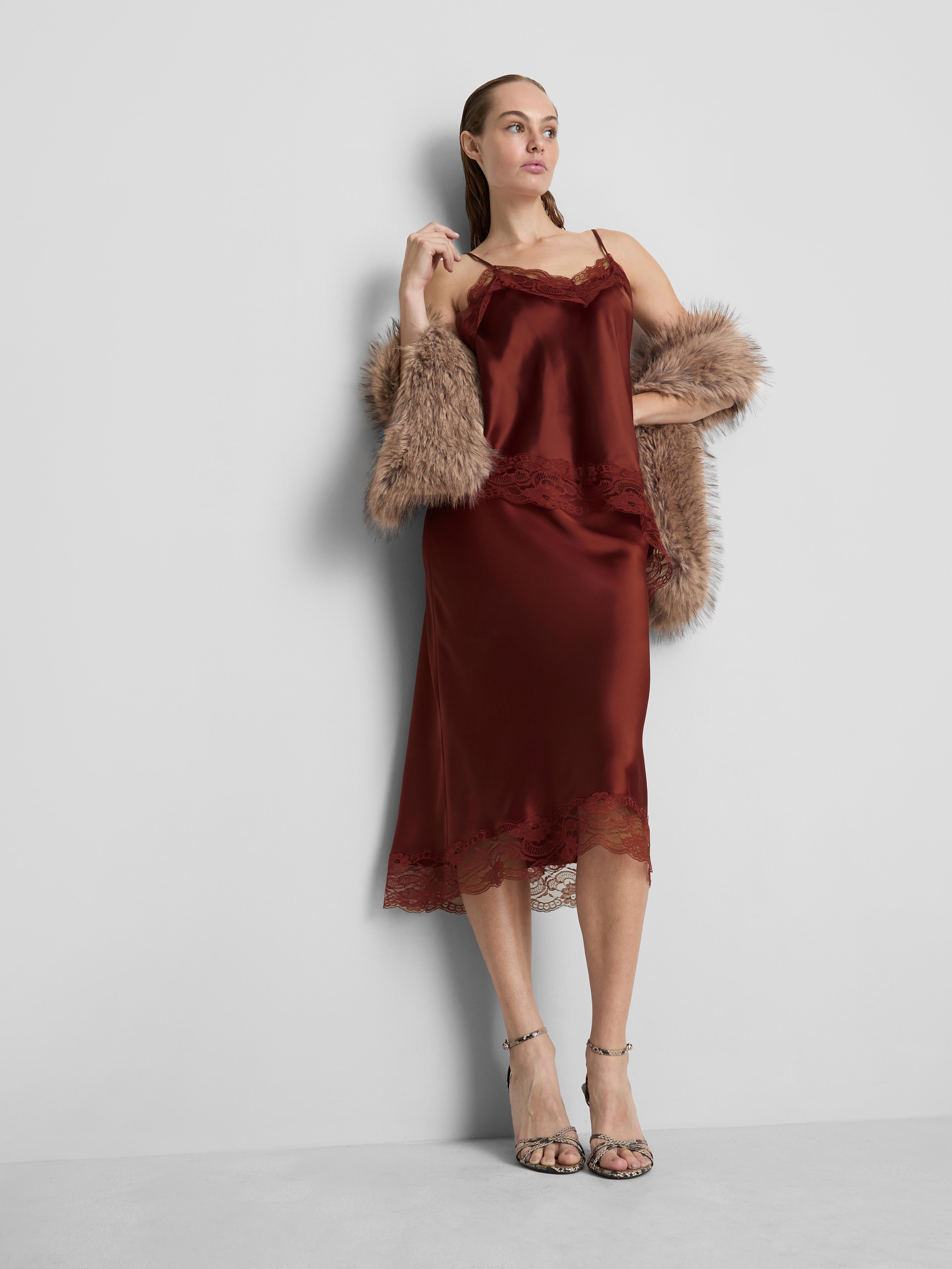 This satin cami comes with a V-neck design, with lace trims and a gorgeous asymmetric hem!