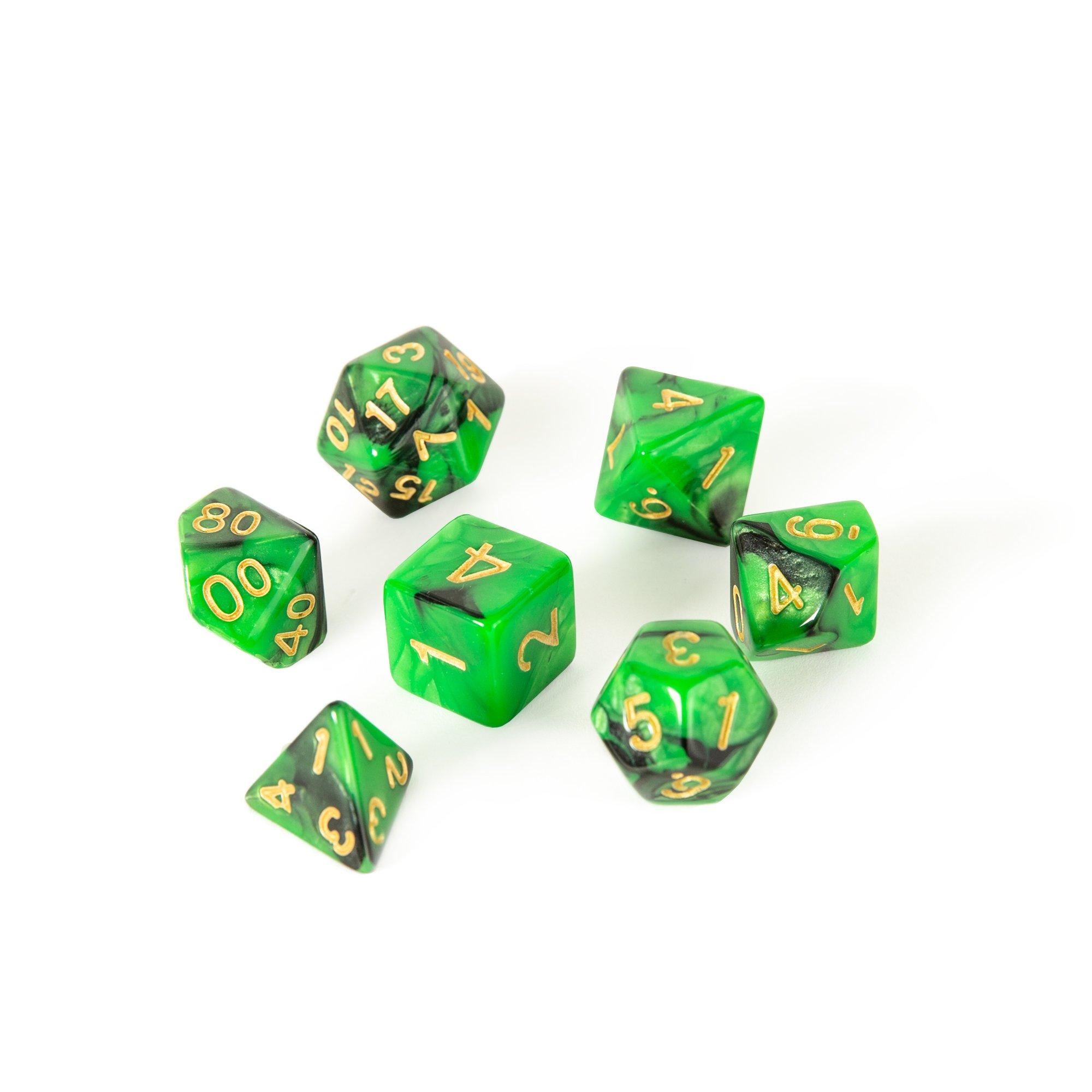 This D20 Dice 7-Set is perfect for role-playing games like Dungeons & Dragons. It comes with one d20, one d12, two d10 (00-90 and 0-9), one d8, one d6, and one d4. The dice are made acrylic and the numbers and engraved and painted to make it easy to read.