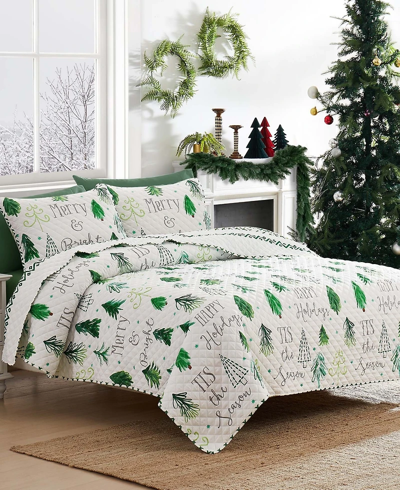 The Avanti Christmas Trees Reversible Quilt Set features a forest of stylized holiday trees in shades of green with seasonal sayings printed on a white quilted ground, reversing to coordinating zig zag stripe. Printed on and filled with polyester for brilliant color and easy care.