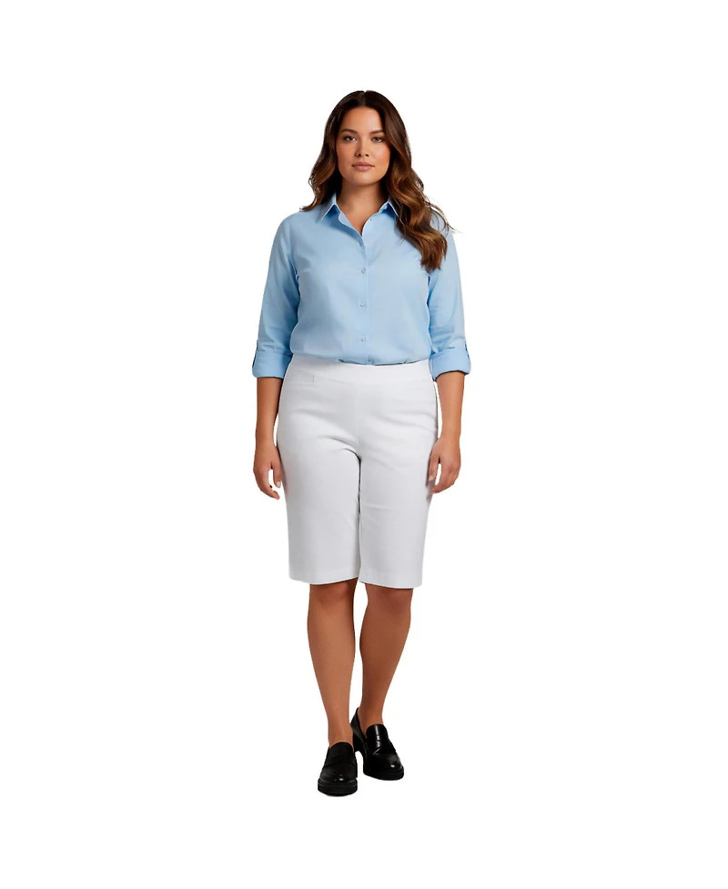 These super-stretch pull-on shorts feature a smooth, easy fit with a clean, streamlined silhouette. Designed with a comfortable waistband and faux pocket detailing, they offer flexibility and a polished look without sacrificing comfort. Perfect for everyday wear, they move effortlessly from casual outings to relaxed days at home.fabric: Feels smooth and cool to the touch, with a soft, fluid hand. It has a sleek, resilient feel that provides structure without stiffness, along with comfortable stretch and recovery.fit: Pull-on fit. Elastic waist.care: Machine Wash. Key Features Include:75% Viscose, 22% Nylon, 3% Elastane. Fabric has stretch.Imported. Inseam: 12"". Plus Sizes 14-36Avenue