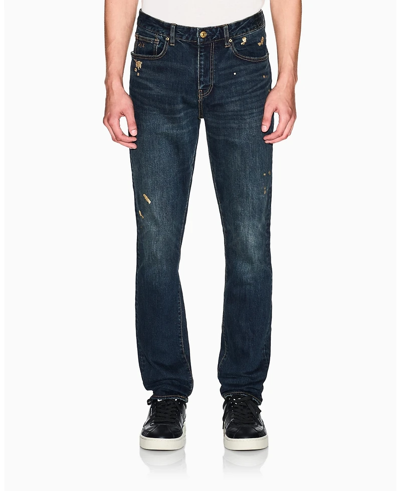Stand out in our dark wash denim, elevated with bold gold splatter detailing. This slim fit style blends edgy flair with everyday ease perfect for turning heads while staying effortlessly cool.