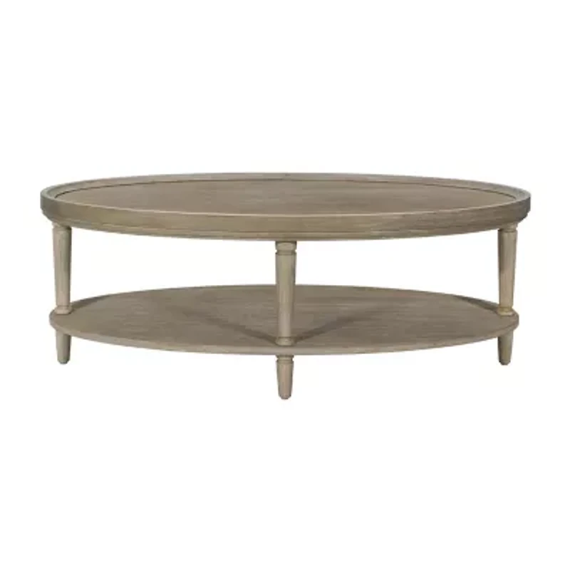Experience sophistication with the Ayanna oval coffee table from Martha Stewart's Bedford collection. The oval shape not only adds a touch of elegance but also ensures smooth lines and flow in your living space. Coupled with a distinctive raised edge, it's designed to keep items secure and prevent them from falling off. This classic farmhouse piece, in a reclaimed greige finish and elegant turned legs, seamlessly marries style and function. It features fixed shelving and adjustable levelers for optimum utility. Easy assembly with tools included. Add a touch of refined curvature to your decor!