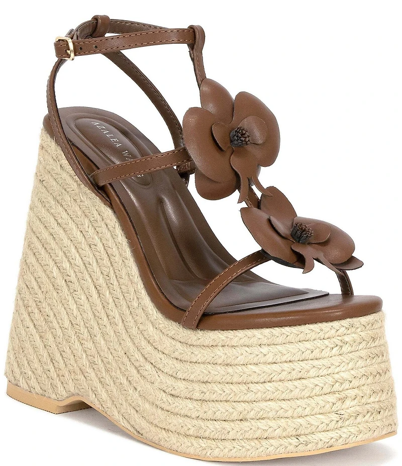 From Azalea Wang, the Barossa Flower Espadrille Platform Wedge Sandals feature: Synthetic upper Dimensional flower ornaments Buckle closure Synthetic lining Synthetic outsole Approx. 6" espadrille rope wrapped wedge height Approx. 3" espadrille rope wrapped platform height Imported.