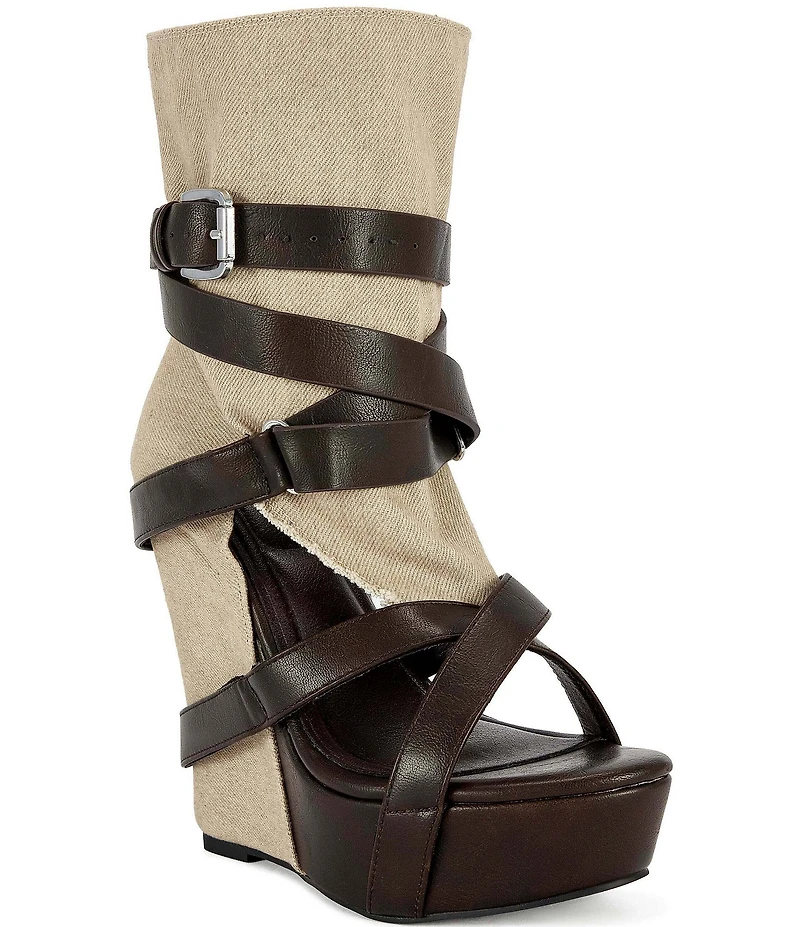 From Azalea Wang, the Rothko Canvas Wraparound Straps Sandal Booties feature: Canvas upper Synthetic buckled wraparound straps Synthetic lining Synthetic outsole Approx. 5.5" shaft height Approx. 5.5" overlasted covered wedge height Approx. 1.5" covered platform height Imported.