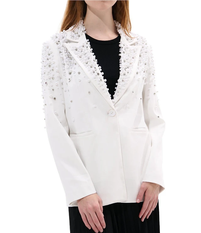 Karen Kane Crepe Woven Pearl Embellished Notch Collar Long Sleeve Button Front Blazer