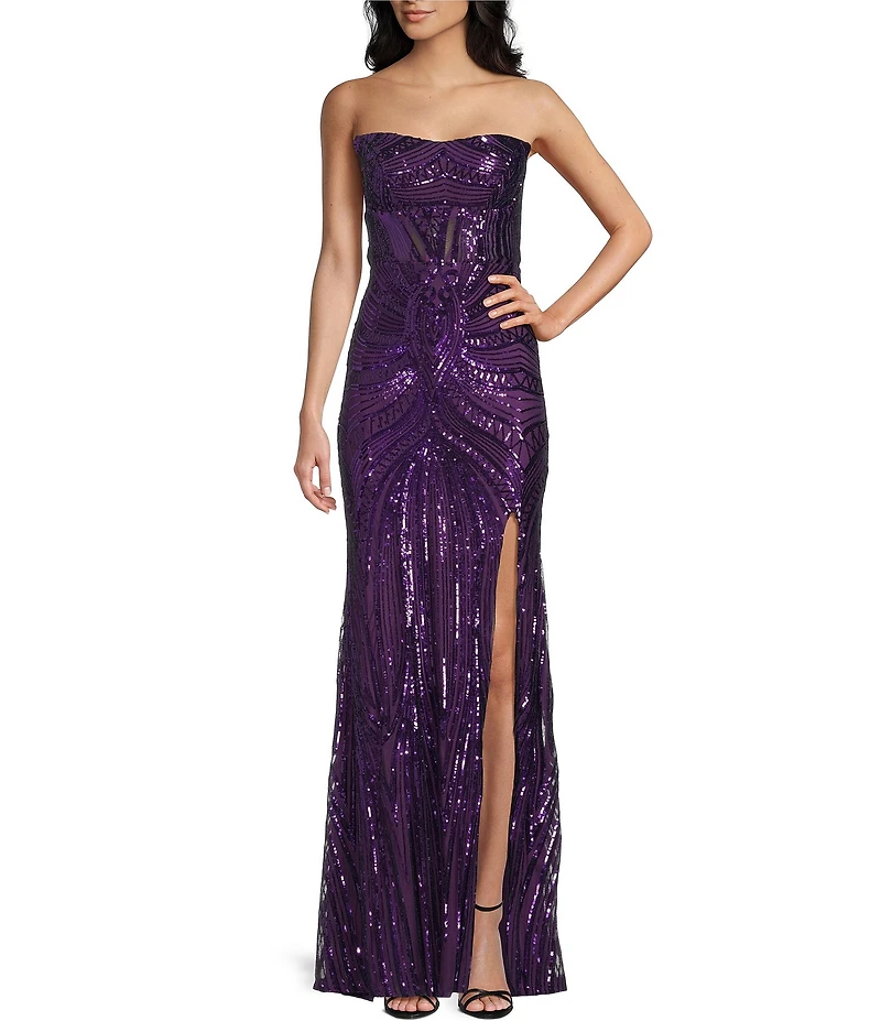 B. Darlin Sequin Patterned Strapless Corseted Lace Up Back Side Slit Dress