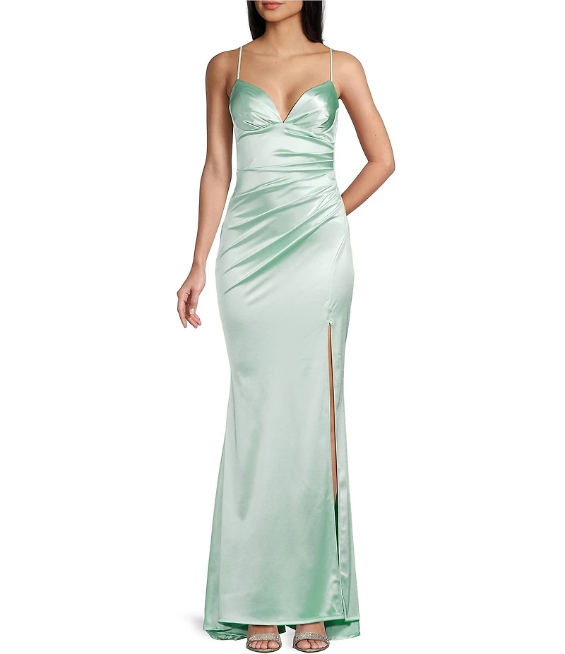 B. Darlin V-Neck Shirred Front Slit Long Satin Dress