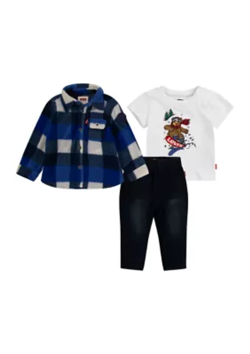 Keep him cozy this fall and winter with this super cute set from Levi's® featuring a plaid jacket, a graphic t-shirt, and denim pants. 3-piece set Jacket: button closure, collar, long sleeves T-shirt: pullover, round neck, short sleeves Pants: elastic waistband Imported Material & Care Cotton, polyester Machine washable