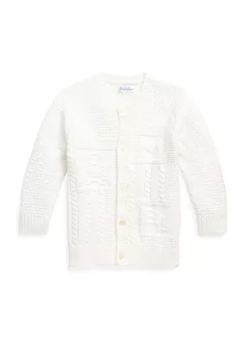 In premium organic cotton, this Ralph Lauren Childrenswear cardigan is knit using multiple techniques and features a playful tonal motif. Size 9 months has a 12.5" body length (front and back) and a 9.75" sleeve length Crew neck Buttoned placket Long sleeves with rib-knit cuffs Heart, Polo Bear, and "RL" intarsia-knit at the front. Heart, Polo Bear, and "ABC" intarsia-knit at the back Rib-knit hem Imported Material & Care Cotton Machine washable