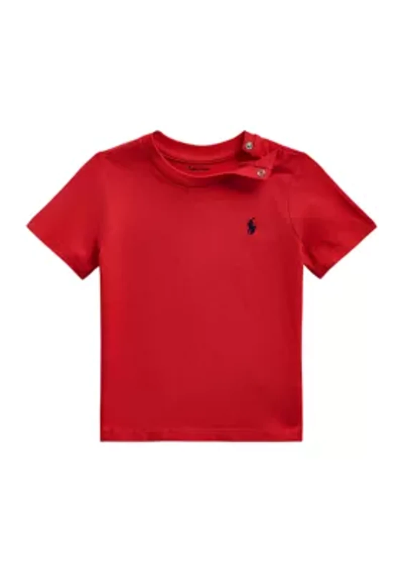 Ultrasoft cotton jersey and Ralph Lauren’s meticulously embroidered Pony make this baby boys' crew neck t-shirt from Ralph Lauren Childrenswear an everyday essential. Sizes 3 to 12 months have a two-snap placket at the left shoulder Crew neck Short sleeves Signature embroidered Pony at the left chest Imported Product Specifications Size 9 months has a 13 in body length (front and back) Material & Care Cotton Machine washable