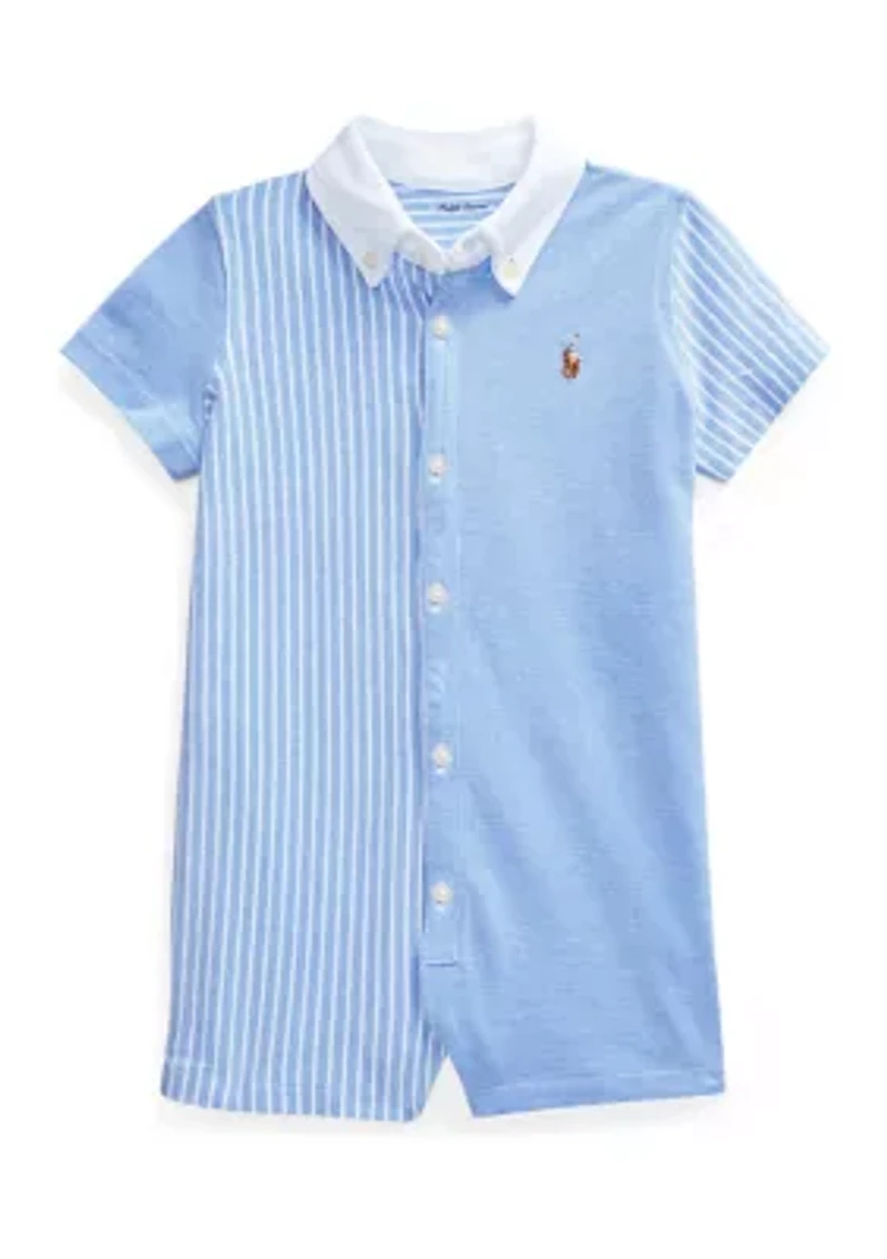 Inspired by two of Polo's icons, this one-piece combines the look of an oxford with the comfort and ease of the Polo shirt’s cotton mesh fabric. Buttoned placket Concealed ring snaps at the hem Button-down point collar Short sleeves Signature embroidered pony at the left chest Size 9 months has a 17.75 in body length Oxford fabric Imported Material & Care Cotton Machine washable