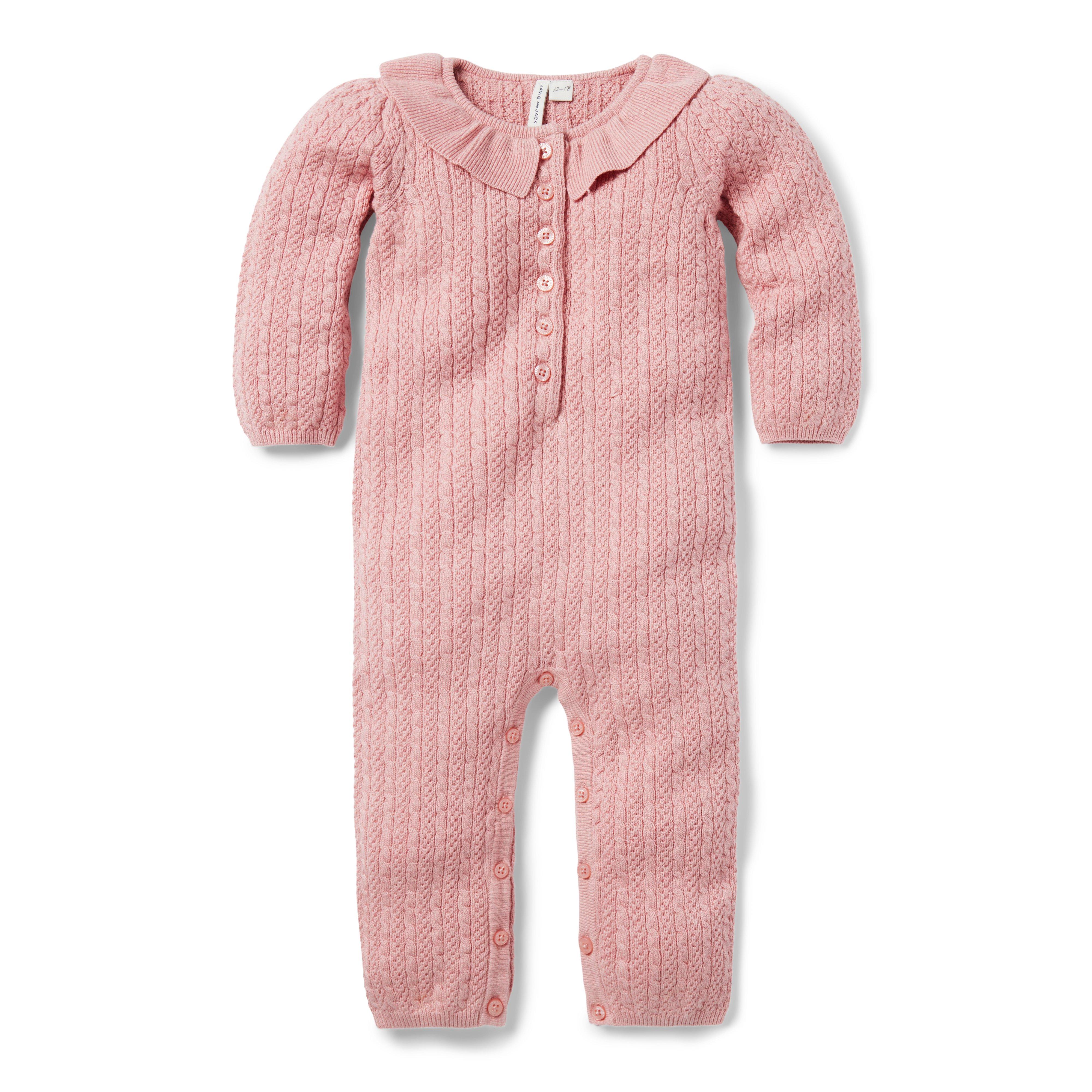A soft sweater one-piece with details to love, from the textured cable knit to the ribbed ruffle collar. It's a forever favorite. 56% Cotton/23% Rayon/21% Nylon Long Sleeve Button Front Full Leg Buttons Makes The Perfect Gift For Baby Machine Wash, Inside Out, Gentle Cycle; Imported