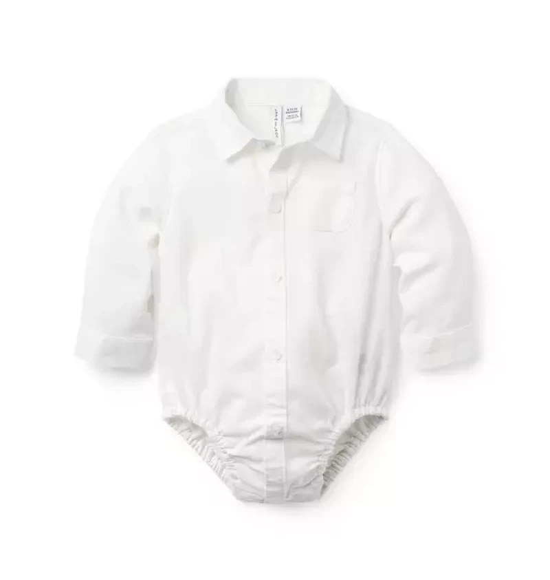 A style classic, made for baby. Finished with a little chest pocket, our linen-cotton bodysuit pairs perfectly with just about everything. 52% Linen/48% Cotton Long Sleeve Button Front; Snaps Underneath Front Pocket Center Back Pleat Machine Washable; Imported