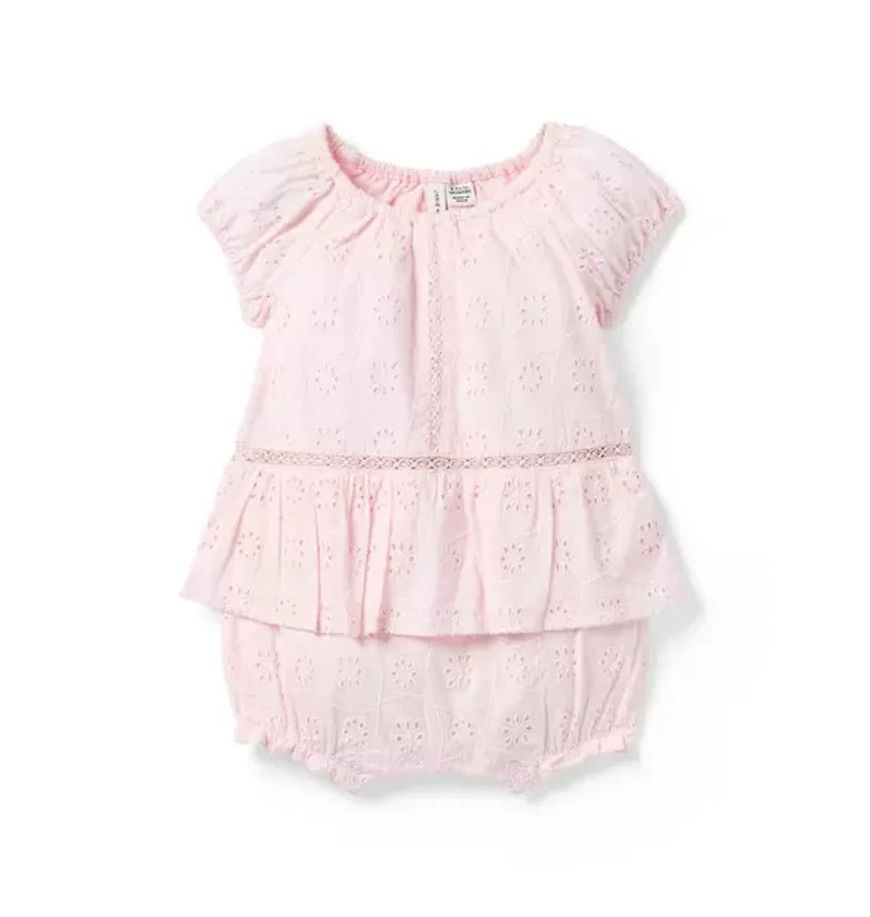 We'll never say no to eyelet florals. With a peplum detail, lace trim and puff sleeves, our romper is a must for fashionable first moments. 100% Cotton Eyelet; Lining: 100% Cotton Fully Lined Short Sleeve Snaps Underneath Makes The Perfect Gift For Baby Online Exclusive Machine Wash, Gentle Cycle; Imported