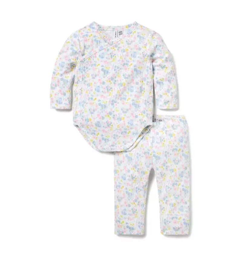 Welcome baby in our soft floral print set. In a cozy pointelle knit, featuring a kimono-inspired wrap bodysuit and a pull-on pant with a little back pocket, just because. 100% Cotton Pointelle Long Sleeve Snap Front; Snaps Underneath Elasticized Waist; Back Pocket Makes The Perfect Gift For Baby Machine Wash, Inside Out; Imported