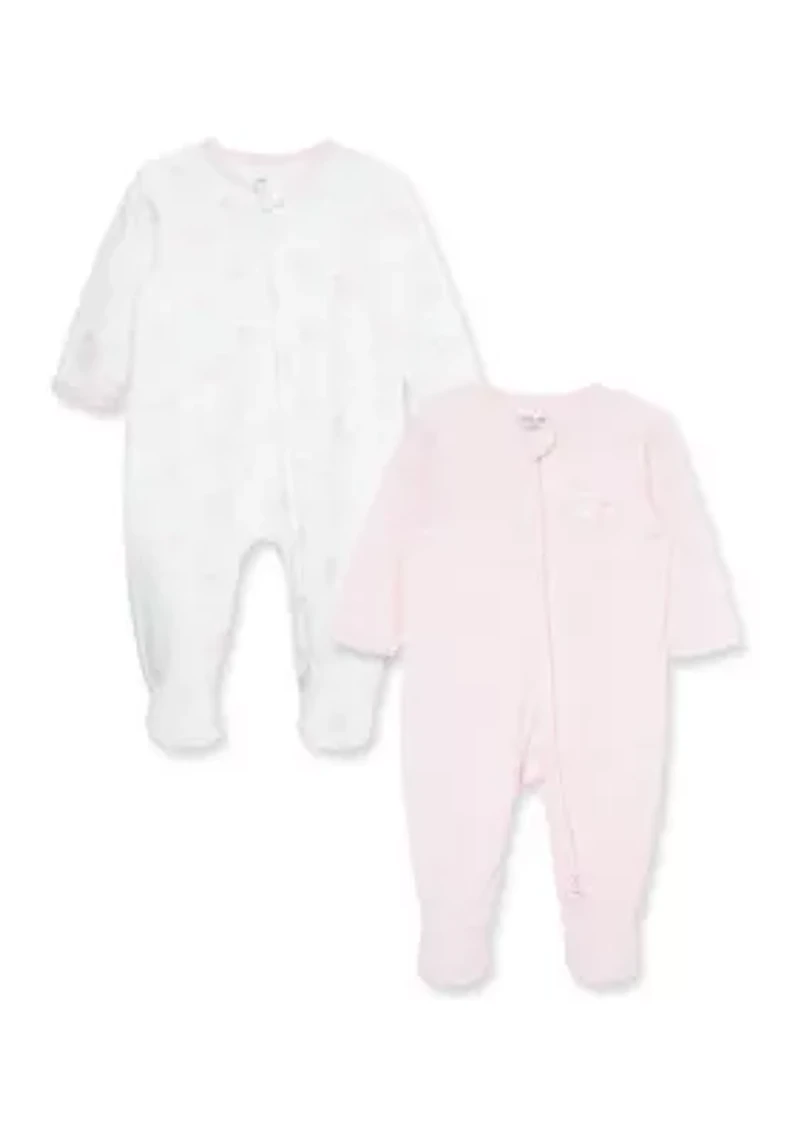 A two-pack of Little Me footies perfect for naptime or playtime. Both have zippers down the front, one has an allover bear print, and the other has an allover stripe print with a bear motif on the top right. Set of 2 Zip closure Round neck Long sleeves Imported Material & Care Cotton Machine washable