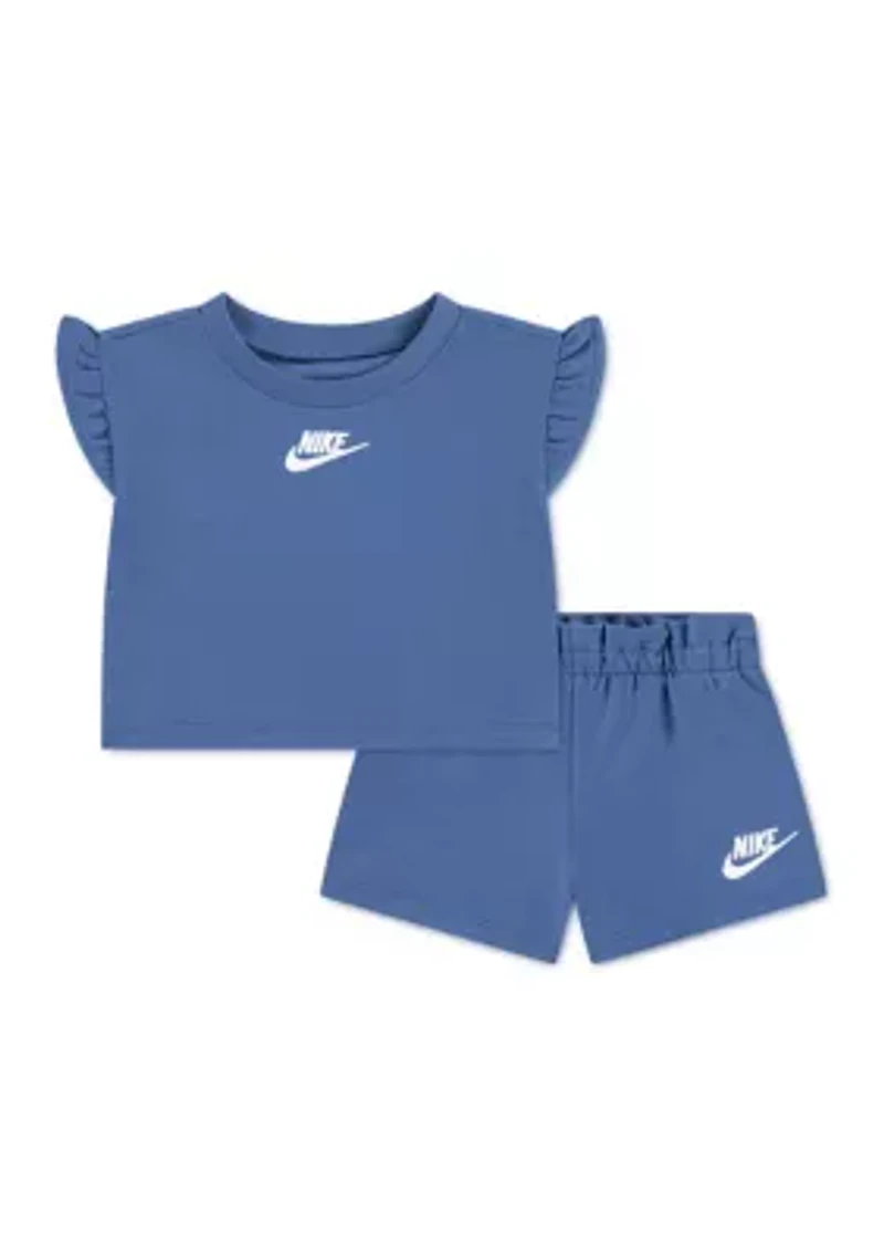 This adorable Nike® two-piece set is perfect for your little one. The crew neck t-shirt features flutter sleeves for a touch of playful style, while the matching shorts offer easy movement. This charming outfit is designed for effortless dressing with a convenient pullover closure. 2-piece set Pullover Crew neck Imported Material & Care Cotton, polyester Machine washable