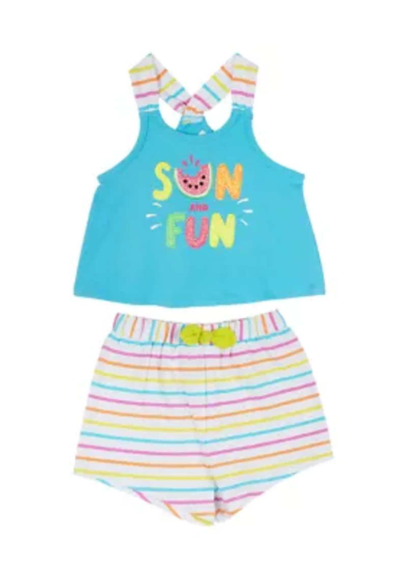 She'll be ready for a day of fun in the sun when she wears this cute set from Counting Daisies. Featuring a colorful top and a pair of striped shorts, this set is a sweet choice for your baby girl. 2-piece set Top: pullover, scoop neck, sleeveless Shorts: elastic waistband Imported Material & Care Cotton, polyester, spandex Hand wash