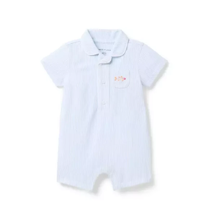 A one-and-done look made for first moments. Our striped romper in pure cotton pique features an embroidered fish at the chest pocket, plus piped details. 100% Cotton Pique Short Sleeve Half Button Placket; Snaps Underneath Chest Pocket; Back Pocket Makes The Perfect Gift For Baby Machine Wash, Gentle Cycle; Imported