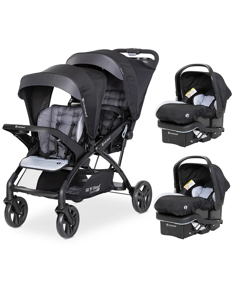 Give yourself and your baby the utmost safety and comfortable travel experience with the Baby Trend Sit N' Stand Double Stroller and 2 Ez-Lift Plus Car Seats. The stroller offers multiple configurations, including seating 2 children in seats, a younger child in a car seat, and an older child standing on the rear platform. Streamlined, single front wheels allow for an easy push and compact footprint while your children stroll in quality, comfort, and style.a 5-point safety harness provides maximum security, ensuring your children are well-protected at all times. The front seat features a removable 2-panel canopy, and the rear seat has a fixed canopy with visors to block the sun, providing even more protection from the elements. Your little ones can enjoy the journey in a secure and cozy environment.Included with this travel system are 2 Ez-Lift Plus Car Seats that seamlessly integrate with the double stroller for infants and toddlers.