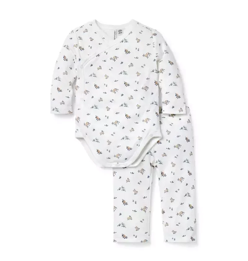 Welcome baby in our soft cotton set featuring an allover woodland animal print. With a kimono-inspired wrap bodysuit and a pull-on pant with a little back pocket, just because. 100% Cotton Duofold Long Sleeve Snap Front; Snaps Underneath Elasticized Waist; Back Pocket Makes The Perfect Gift For Baby Machine Wash, Inside Out; Imported