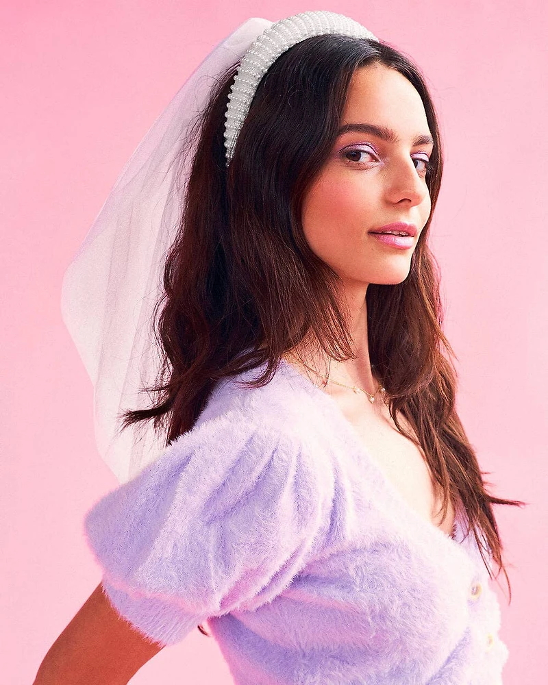 Details:  Pearl headband removable veil velcro attachments