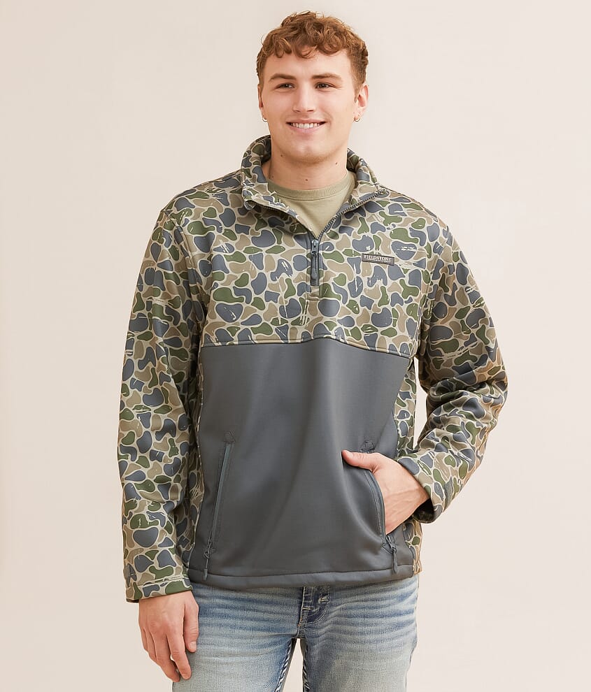 Camo print fleece lined mock neck pullover Cinch tie hem Adjustable hook and latch cuffs