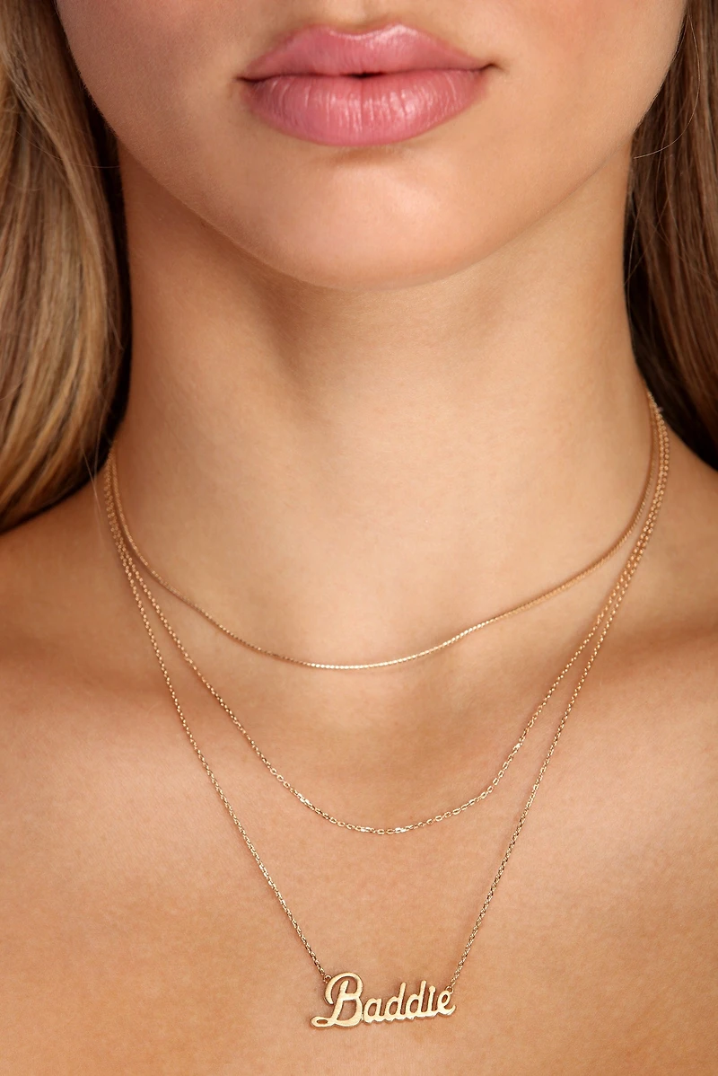 Ooo babe, you a chic baddie! Layer on these necklaces for a trendy vibe! The pack features two separate necklaces, the shorter one featuring two dainty chains, and the longer one showcasing a charm with the script "Baddie." Both include adjustable lobster clasp closures.