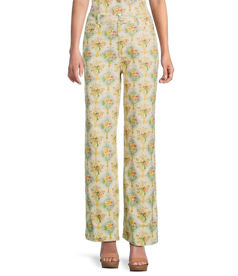From Bailey Rose, these jeans feature: Allover print Mid-rise Belt loops Front button/zip closure Belt loops 5-pocket styling Full length Wide legs Cotton blend Hand wash Imported.