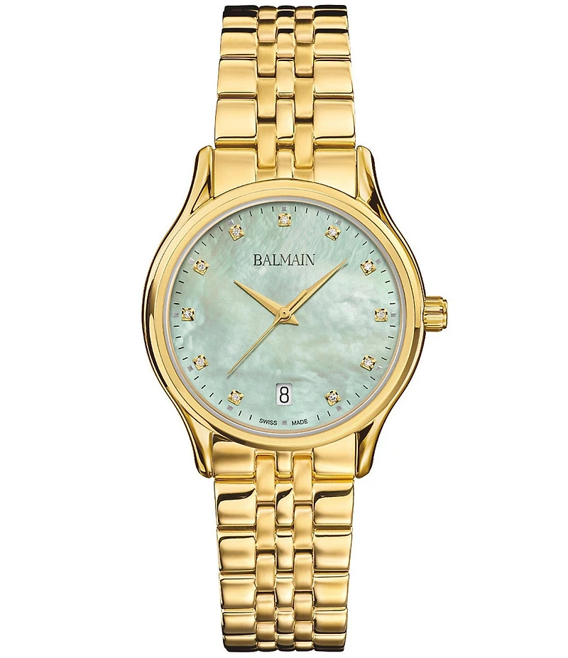 From Balmain, this women's watch features: Round case shape Stainless steel bracelet and case with pvd coating Mother of pearl dial Quartz analog movement Butterfly with pusher closure Case size approx. 32mm Water-resistant up to a pressure of 5 bar (50 M / 165 Ft) Swiss made Imported.