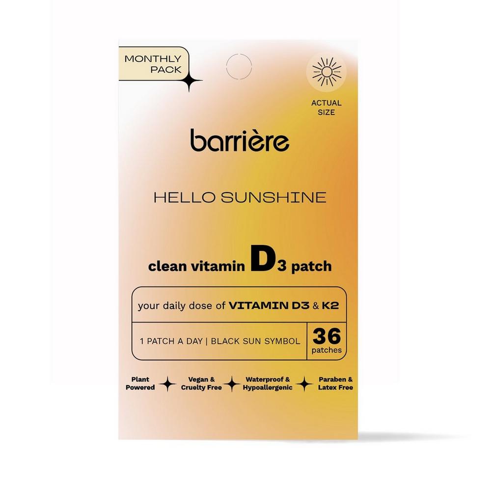 HELLO SUNSHINE Vitamin D3 Patch 36 Pack. Benefits: Boost mood. Support healthy bones. Increase energy. Replace lack of sun exposure. Key Ingredients: Vitamin D3 (Cholecalciferol) is a fat-soluble vitamin that is made by the skin when exposed to sunlight and is naturally present in few foods. It supports healthy immune function, supports mood, and supports brain and bone health. Our patches are formulated with a vegan D3 (cholecalciferol) sourced from Lichen.. :