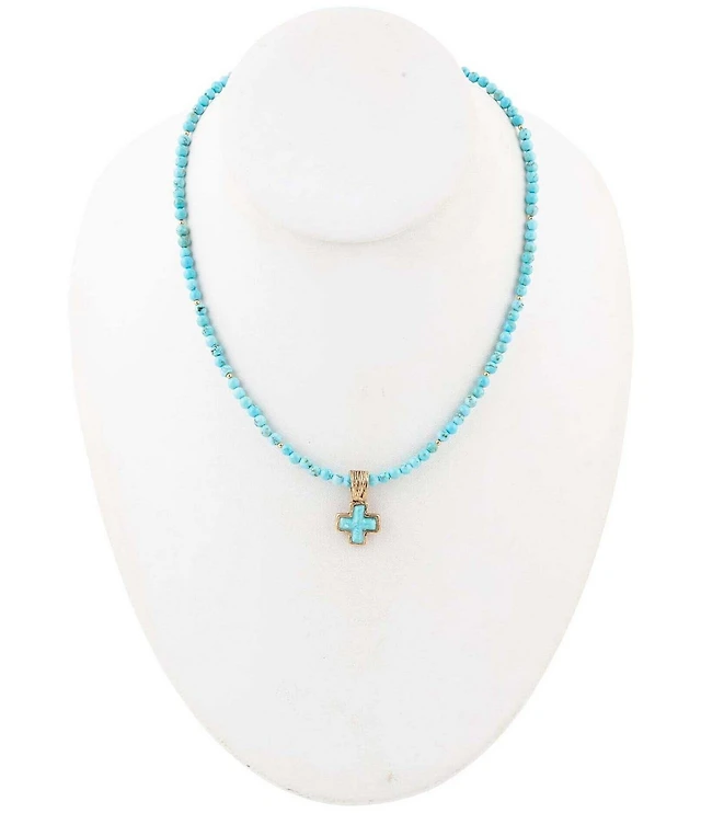 Barse Blue Turquoise Beaded Golden Cross Pendant Necklace