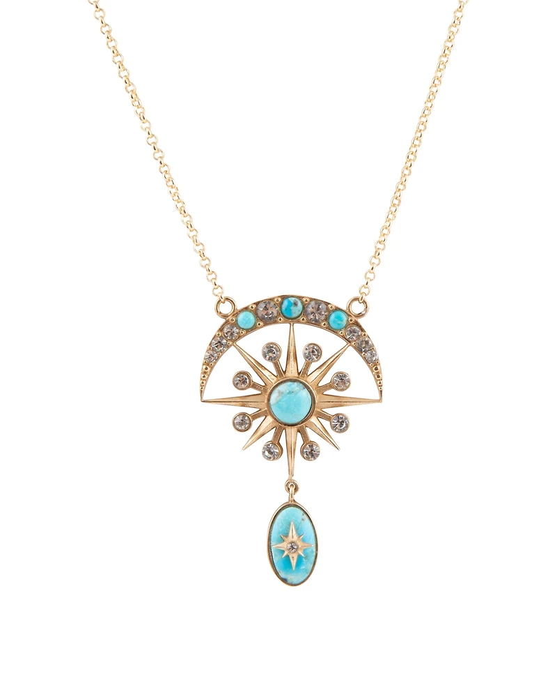 This exquisite golden bronze necklace features a star adorned with cubed zirconia and genuine blue turquoise. Surrounding the star are matching turquoise stones and cubed zirconia, creating a harmonious design. The necklace measures 17.5"" in length plus a 2"" chain extender and a lobster clasp. The Hanging pendant measures 1.99"" long and 1.25"" at its widest point, this handcrafted piece weighs a total of 11.1g, reflecting meticulous artistry and refinement.