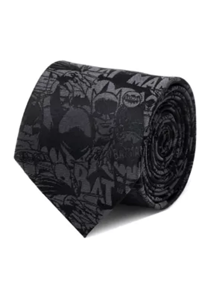 The Batman Comic Black Tie features a comic book pattern woven in a black-on-black tonal design for a subtle and sophisticated look. Made of 100% silk, this necktie has a bit more character than your typical "black tie" but is subtle enough even for more formal events and weddings. Novelty Imported Material Silk