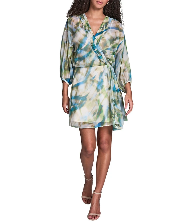BCBG Printed Chiffon V-Neck 3/4 Sleeve Side Knot Shift Mini Dress