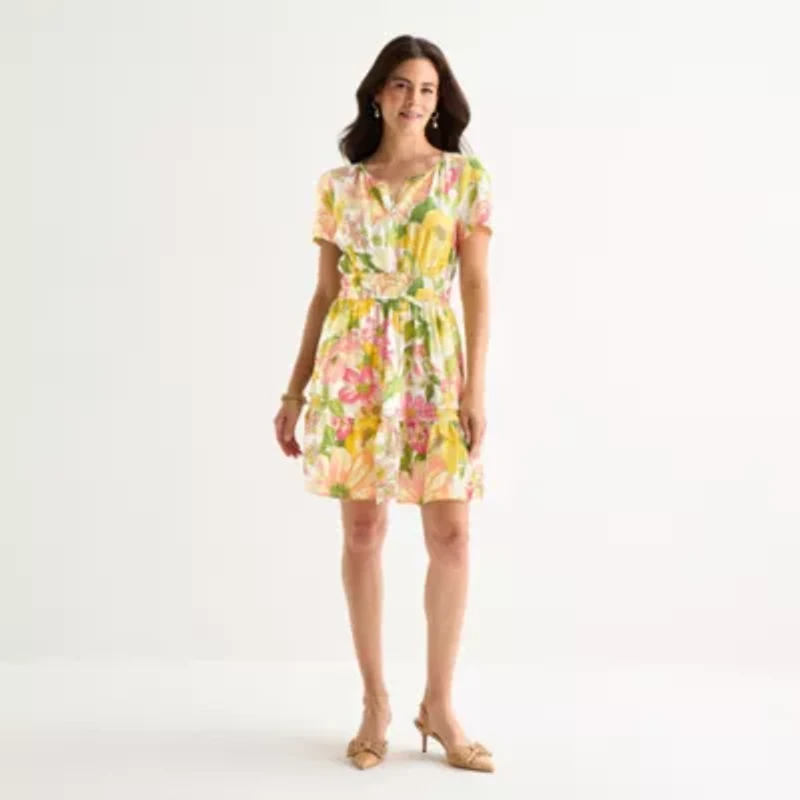 Be by CHETTA B Womens Short Sleeve Floral Fit + Flare Dress