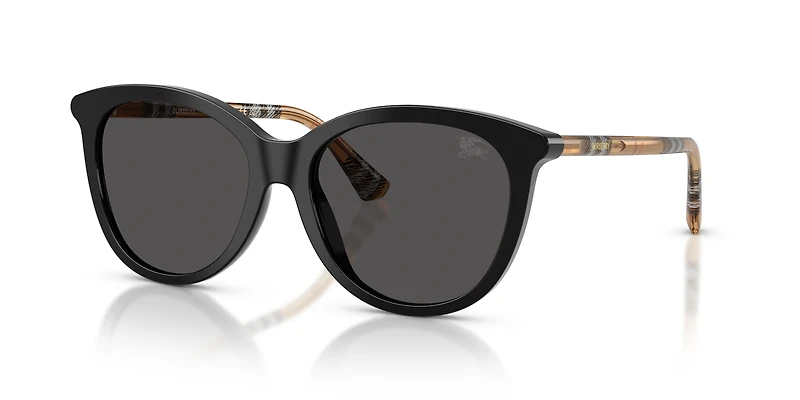 Elevate your everyday style with the Burberry BE4455F sunglasses. These acetate full-rim phantos frames blend retro charm with modern sophistication, featuring sleek black sunglasses front and classic grey lenses. Designed with the sunglasses' low bridge fit for added comfort, they showcase contrasting tubular temples in the iconic Burberry Check. A gold logo set within a grooved surface and the lasered Equestrian Knight Design on the left lens add a refined finishing touch. Effortlessly timeless and undeniably elegant.