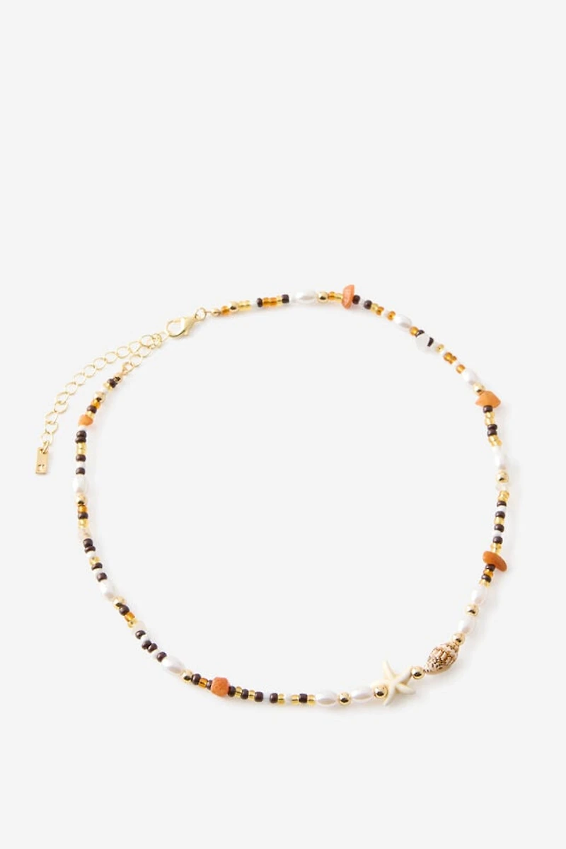 Comfort meets style. The Beaded Necklace features a mix of glass, shell, and semi-precious stone beads in warm gold, brown, and cream tones. This statement piece brings texture and dimension to any look. Layer it with your favourite chains or let it shine solo.
