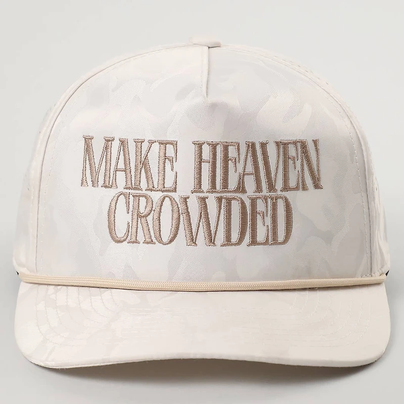 These custom white hats feature the embroidered phrase “MAKE HEAVEN CROWDED” in various colors. They include subtle camouflage patterns, breathable perforations, and decorative piping details around the brim. This 5-panel trucker hat features a subtle white camo print paired with a classic rope strap detail for a clean yet distinctive look. Crafted from lightweight, breathable 100% polyester, it offers comfortable all-day wear. The structured front panel is balanced with a pre-curved visor and a relaxed fit. Finished with an adjustable snapback closure, this hat provides a secure, customizable fit that suits a wide range of styles and occasions.