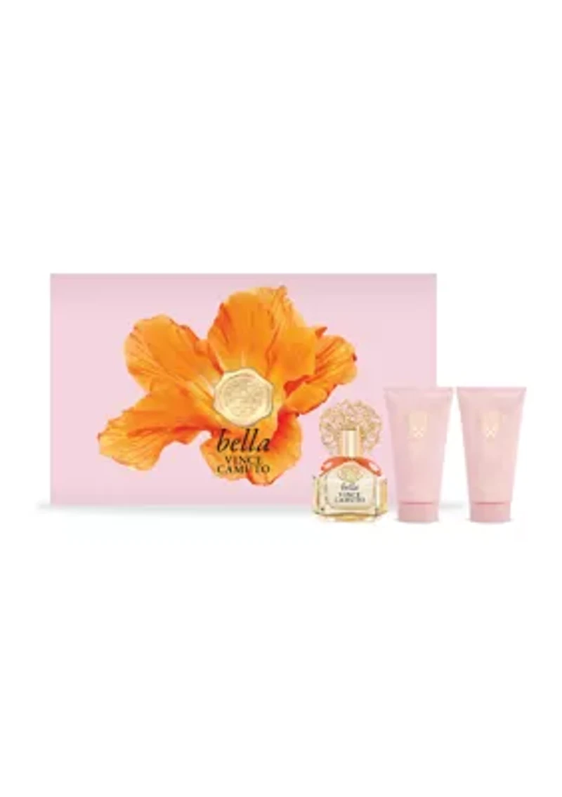 A sparkling fruity floral fragrance. This gift box opens to reveal Bella Eau de Parfum, Shower Gel, and Body Lotion This 3-piece gift set includes: 1.7 oz bella Eau de Parfum, 2.5 oz. VINCE CAMUTO Shower Gel 2.5 oz. VINCE CAMUTO Body Lotion Imported