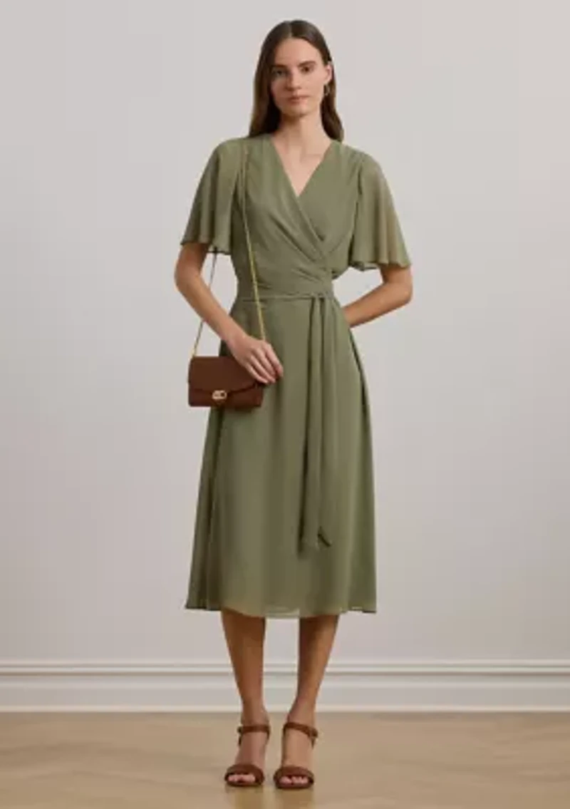 Flutter sleeves add a whimsical touch to this surplice dress, which is crafted with airy georgette for effortless movement with each step. A self-belt cinches the waist and enhances its fit-and-flare silhouette. Fit-and-flare silhouette Intended to hit below the knee Size 8 has a 46" body length Dress length is taken from the center back of the neck and changes 0.5" between sizes Surplice neckline Concealed center back zipper with a hook-and-eye closure Flutter sleeves Pleating gathers at the left waist Threaded belt loops Comes with a self-belt Fully lined except for the sleeves Model is 5'10" (178 cm) and wears a size 4. This product is made with recycled polyester Imported Material & Care Polyester Dry clean only