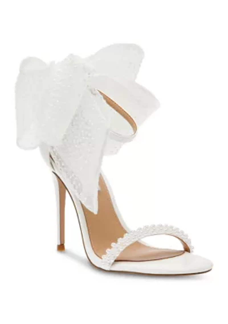 Be the center of attention in the Benni sandals from Steve Madden featuring a sky-high stiletto heel, a stunning bow at the back of the heel and intricate pearl detailing. Buckle closure Imported Product Specifications 4" heel Medium width Material Polyurethane