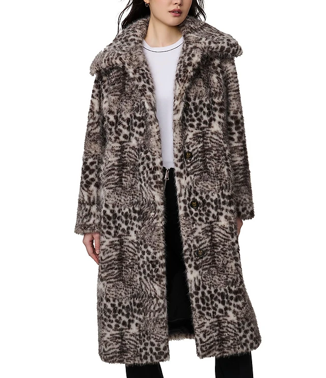 Bernardo Faux Fur Leopard Print Oversize Point Collar Single Breasted Coat