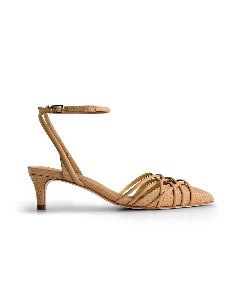 Flattering lines, standout shine. This pointy-toe kitten heel sandal features delicate, intertwining straps that create a sleek, flattering silhouette. Made in monotone snake print or metallic to elevate your look with some texture and dimension.