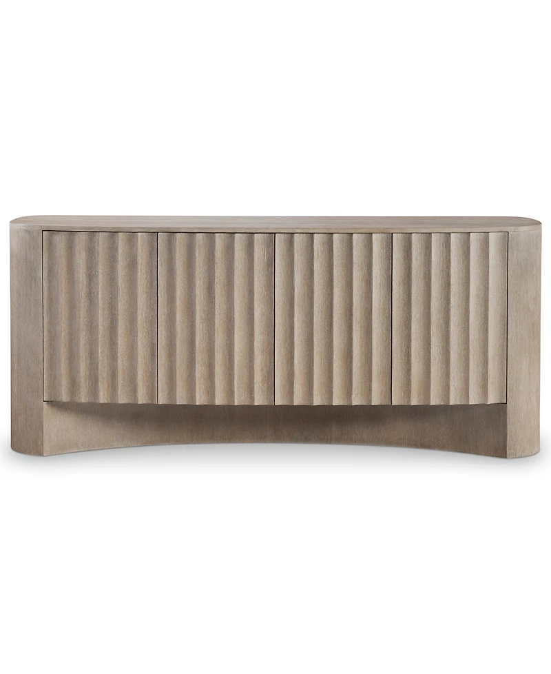 Architectural detailing crafts a mesmerizing design for the Loggia entertainment credenza, in the soft neutral Aria finish. Three push-to-open doors are defined by the clean lines of modern fluting. The base offers a unique concave curve that showcases balance and depth. The doors open to reveal two adjustable shelves, one fixed shelf and one pull-to-open, soft-close drawer. Grommets and vents allow room for electrical cords and entertainment components.