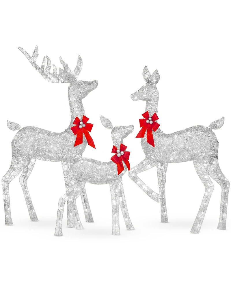 Turn indoor and outdoor decorations and events into a picturesque, winter wonderland! This deer family lights up with 360 Led lights, powered by 2-prong power cords and features warm white LEDs that are environmentally friendly and remain cool to the touch. While delicately beautiful, this set is extremely durable. Keep the decor damage free in winter months with sturdy connections and durable material that withstands winter weather conditions. Assembly is easy! Connect the pieces, secure them with zip ties and stake your decor into the grass with confidence that the water resistant polyester fabric will retain its colorful details. Make no mistake, the holidays were made for a family just like this one!