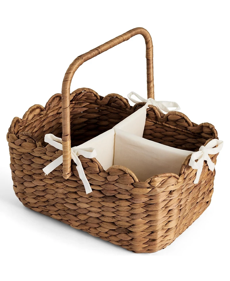 Beautifully handwoven from 100% water hyacinth, this scalloped diaper caddy blends timeless style with everyday function. The removable divider lets you customize compartments for diapers and baby essentials or create one spacious basket, while lightweight construction and sturdy handles make it easy to carry from room to room. Designed for life beyond the nursery, it also doubles as an everyday storage basket, picnic tote, or thoughtful gift basket for special occasions.