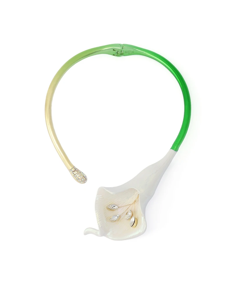 Refined green tonal collar necklace featuring elegant calla lily at front adorned with delicate crystal stones to brighten up any look.